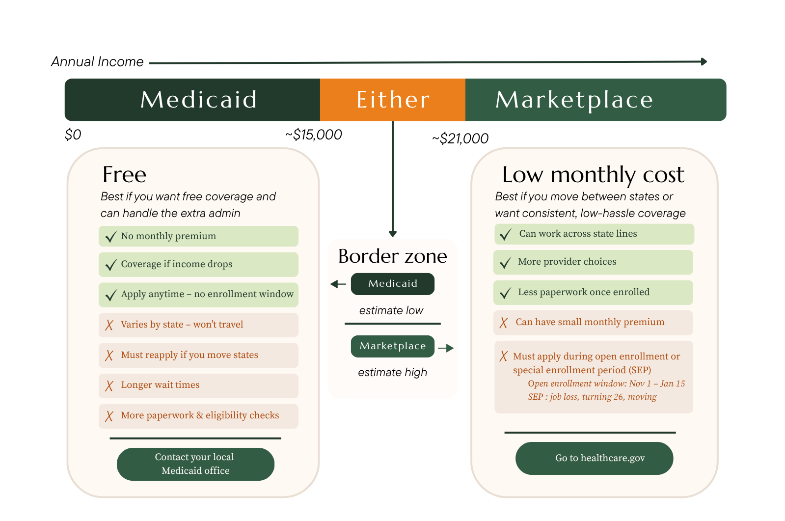 There's also a "border zone" that seasonal workers fall into more than most: the income range where you might qualify for either, depending on when in the year you apply. When income is low (off-season), Medicaid may be the right call. When income is higher (peak season), a Marketplace plan often makes more sense. Neither is inherently better — what matters is knowing where your income sits and acting on it.